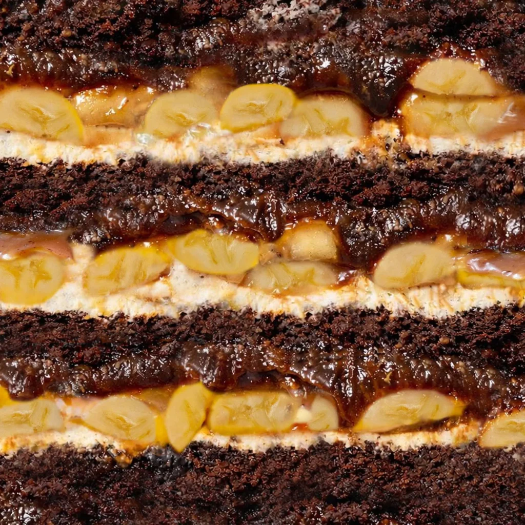 Сочный шоколадный бисквит, ванильный крем, банан и карамель — нежно и гармонично.